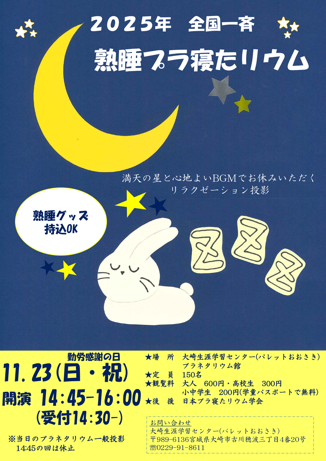 2011年11月に兵庫県明石市天文科学館でスタートした熟睡プラ寝たリウム。翌年2012年11月にパレットおおさきも開始。今年も全国一斉イベントに参加します。